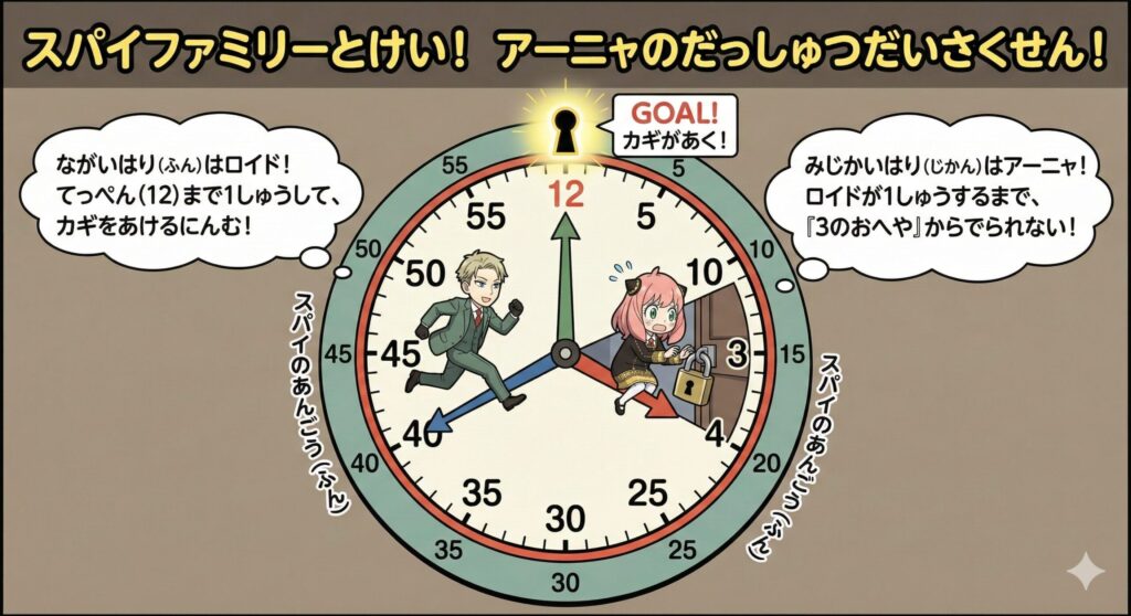 私: 「目的:小学1年生に時計の読み方を教えたい。有名なアニメに例えて教えてほしい。例えば、『スパイファミリー』で」